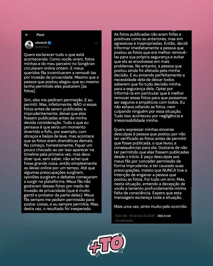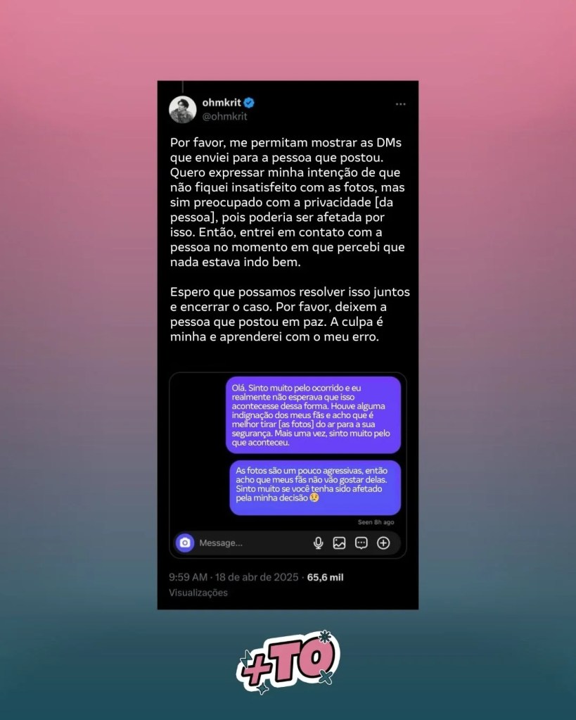 Diante da situação, Ohm se pronunciou por meio de seu perfil oficial na plataforma X. No comunicado, ele explicou que a fã responsável pela postagem havia pedido permissão para compartilhar uma das fotos, mas que ele não teve acesso prévio às imagens antes de autorizar. Após perceber a dimensão da repercussão, Ohm solicitou à pessoa que removesse o conteúdo.