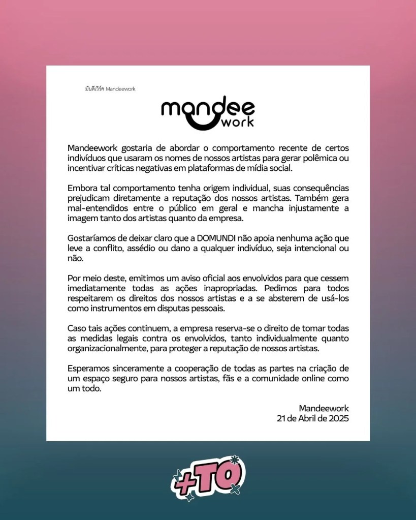 Nesta segunda-feira (21/04), a empresa Mandee Work publicou um comunicado oficial em resposta ao uso indevido do nome de seus artistas em conflitos e polêmicas nas redes sociais. A empresa reforçou que atitudes como essas prejudicam não apenas os próprios artistas, mas também a reputação da agência, deixando claro que não apoia comportamentos que incentivem o assédio ou a difamação online.
