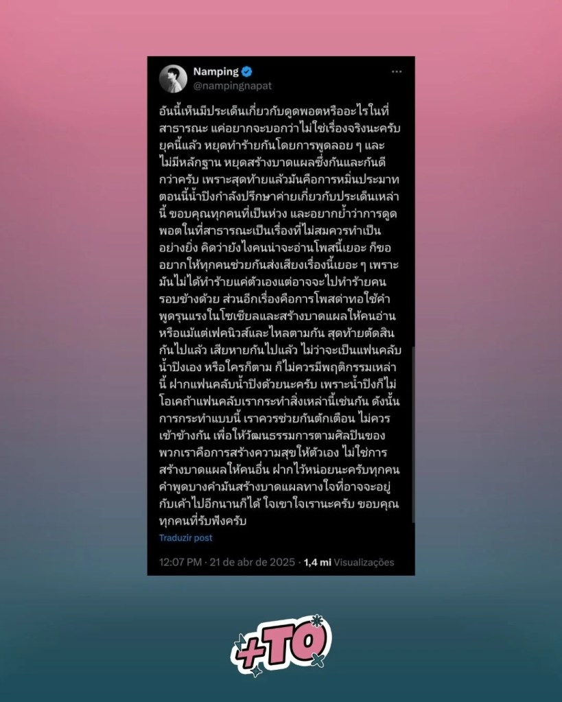 Além disso, a artista Namping, que recentemente foi alvo de acusações sem provas, publicou uma mensagem sensível e firme em seu perfil no X (antigo Twitter), em que reforçou o pedido por mais empatia, compreensão e cuidado nas redes sociais, lembrando a todos da importância de apoiar sem disseminar ódio.