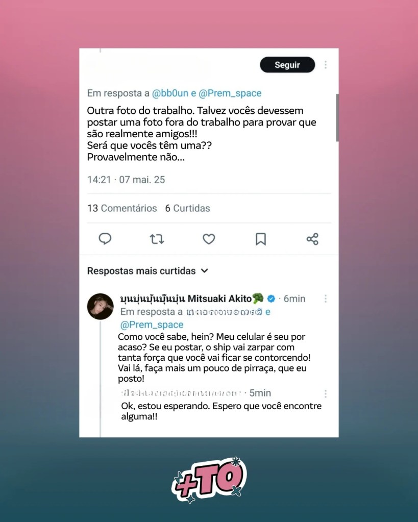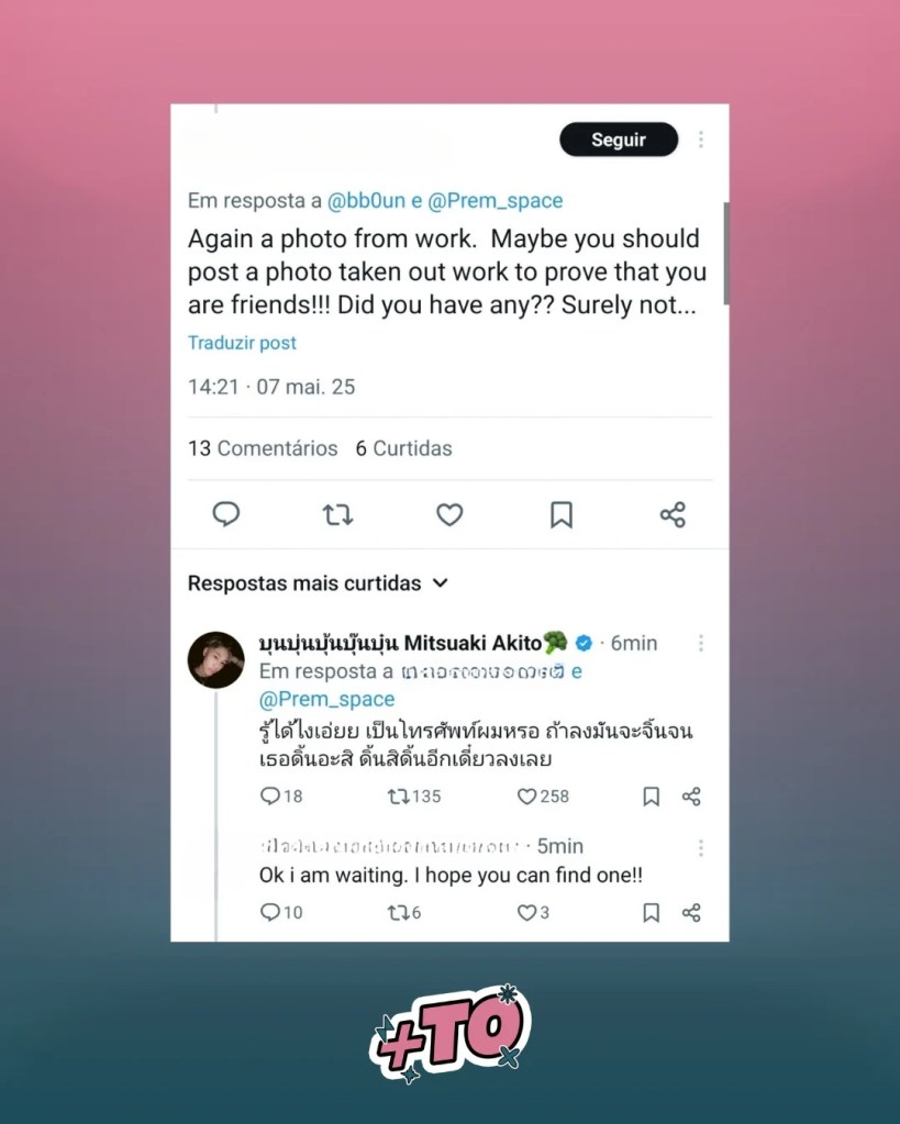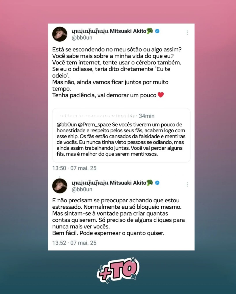 Nesta semana, os atores Boun e Prem, conhecidos por seu trabalho conjunto e grande química em cena, foram novamente alvo de comentários de ódio nas redes sociais. Um internauta questionou a autenticidade do relacionamento entre eles, insinuando que o “ship” seria falso. Boun, no entanto, não ficou em silêncio e respondeu diretamente à pessoa, surpreendendo muitos fãs com sua postura firme.