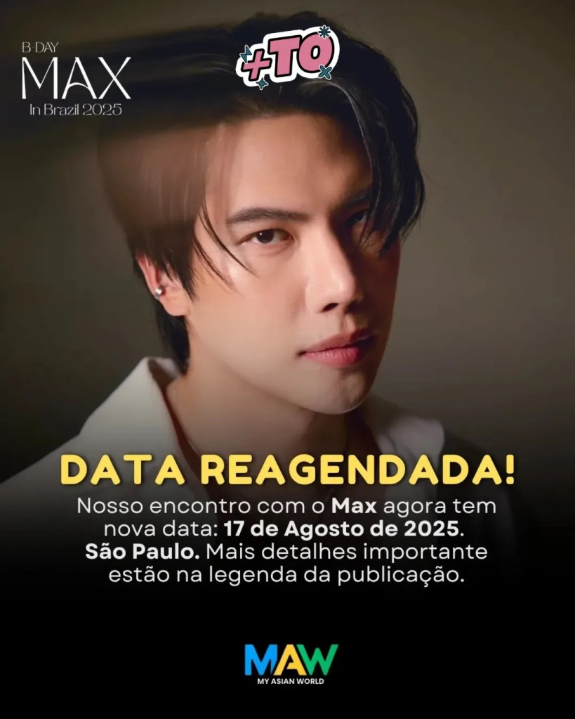 A tão aguardada vinda do ator tailandês Max Nattapol ao Brasil ganhou uma nova data. O fanmeeting que estava previsto para acontecer em 8 de junho, na cidade de São Paulo, foi oficialmente reagendado para o dia 17 de agosto de 2025.