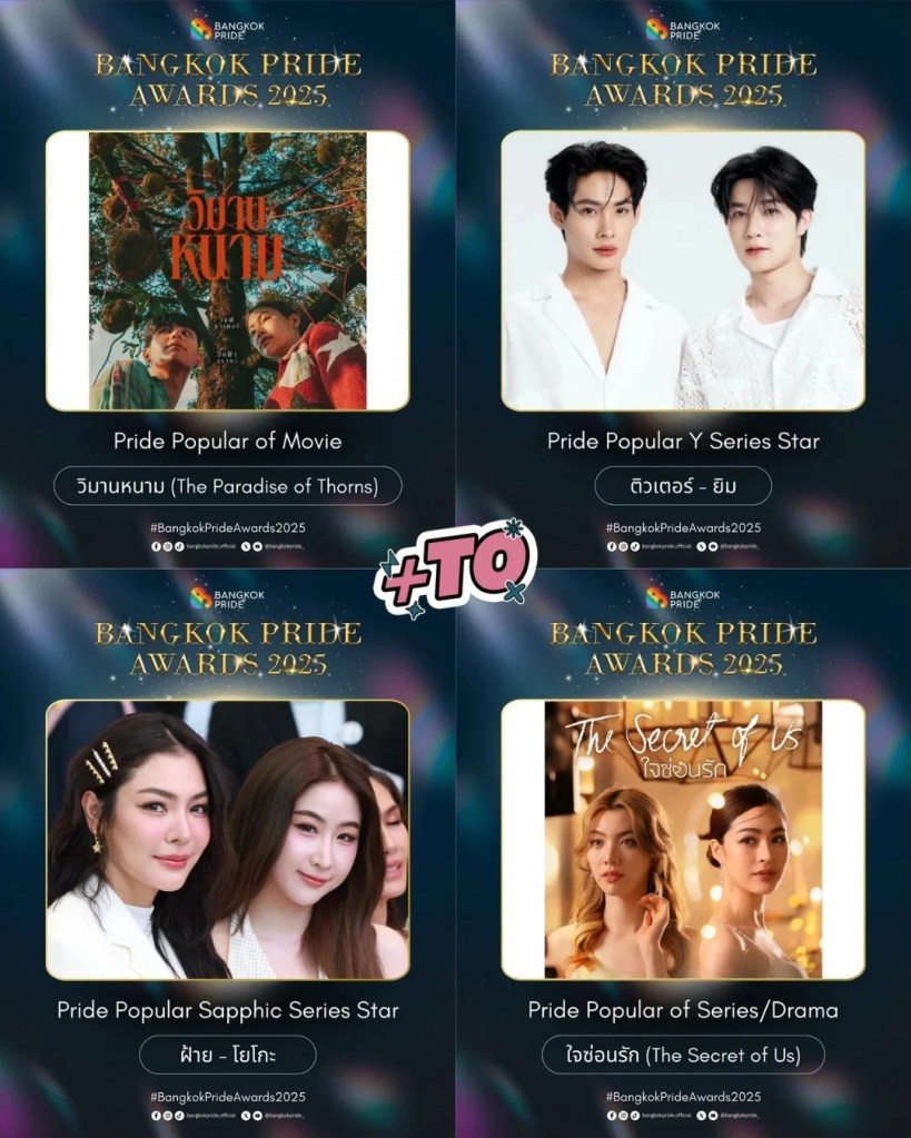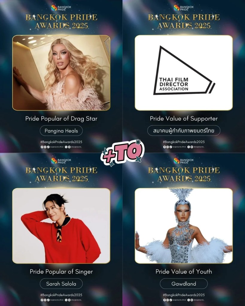 oram homenageados nomes e instituições que se destacaram em diferentes frentes de atuação. A Fundação pelos Direitos e Justiça Sexual, por exemplo, foi reconhecida por seu trabalho em políticas públicas. Já a Associação de Diretores de Filmes da Tailândia recebeu o prêmio por sua contribuição à representação LGBTQIAPN+ na indústria audiovisual.
