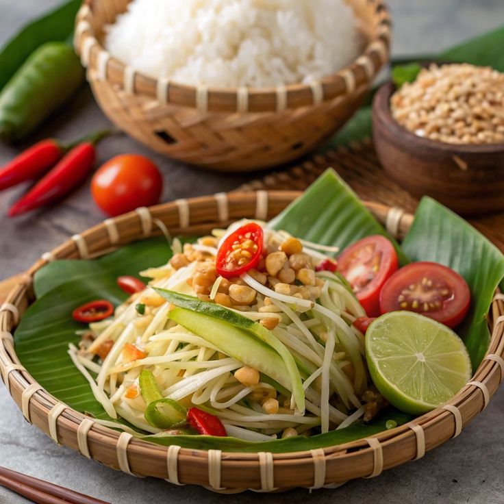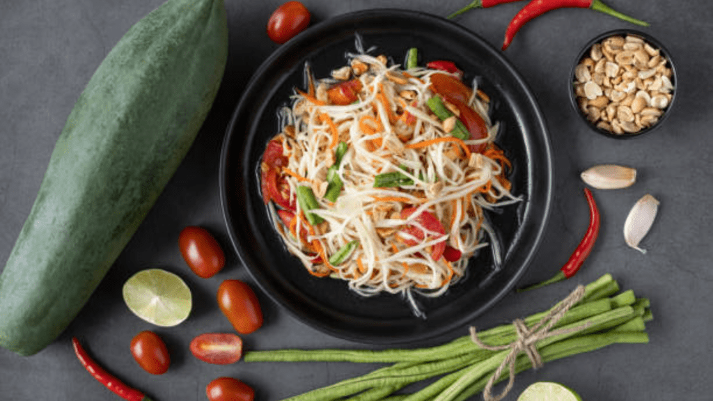 A Salada de Mamão Verde é uma receita originária do Laos, conhecida como Tam Som ou Tam Mak Hoong. É um prato que mistura muitos sabores e texturas, é salgado, picante, azedo e levemente doce que possui um grande significado cultural no Laos.