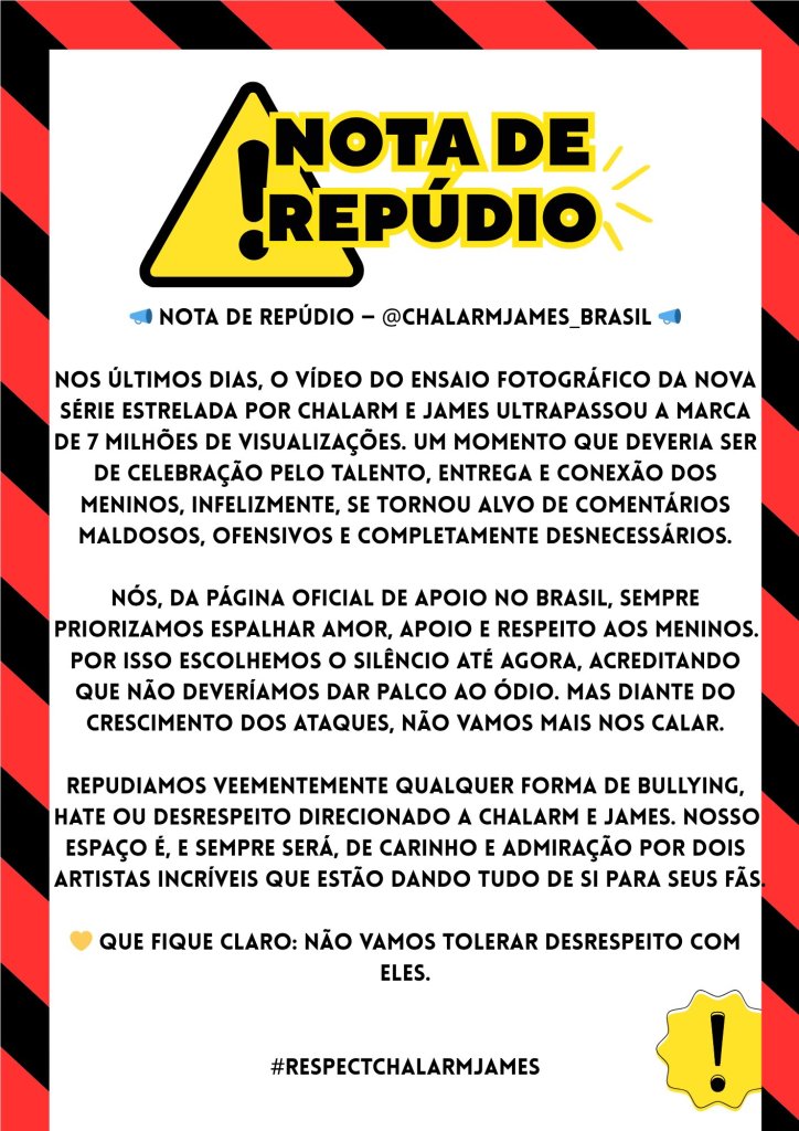 E como se não bastasse, esta semana um vídeo de bastidores dos #ChalarmJames para um novo projeto provocou uma onda de comentários repulsivos e vergonhosos no X e no TikTok. Isso motivou uma nota pública de repúdio da fanbase brasileira (@ChalarmJames_Brasil no X) dos atores, exigindo o básico: respeito.