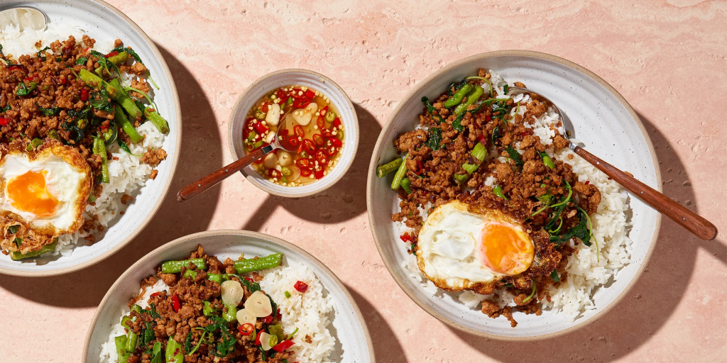 O Pad Kra Pao é um refogado tailandês feito com carne moída, alho, pimenta, um molho suculento e claro o manjericão sagrado tailandês, que é a estrela da receita. Ele é um dos pratos de rua mais populares da Tailândia e também está sempre presente nas refeições diárias das famílias tailandesas, normalmente ele é servido com arroz e ovo frito.
